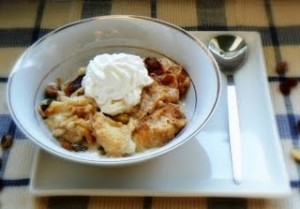 2. Break the puff pastry into pieces, and place in a large bowl. Add the raisins, almonds, pine nuts, pistachios, and coconut, and toss. Pour into a 9×13 inch glass baking dish, and spread evenly.